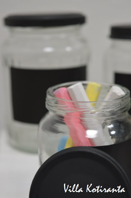 Leikkasin liitutaulutarra-arkista sopivan kokoiset palat ja kiinnitin ne purkkeihin.